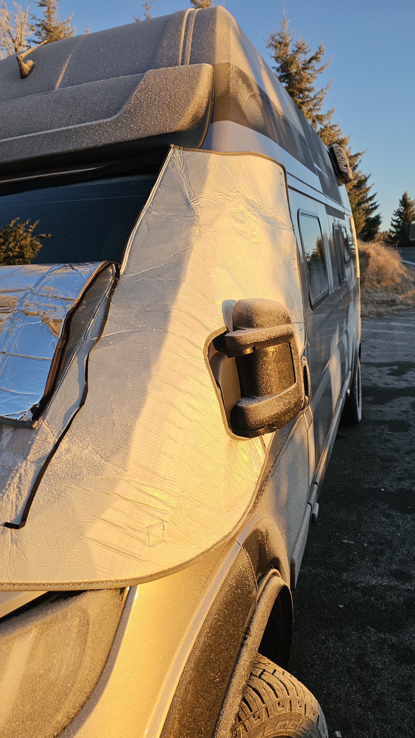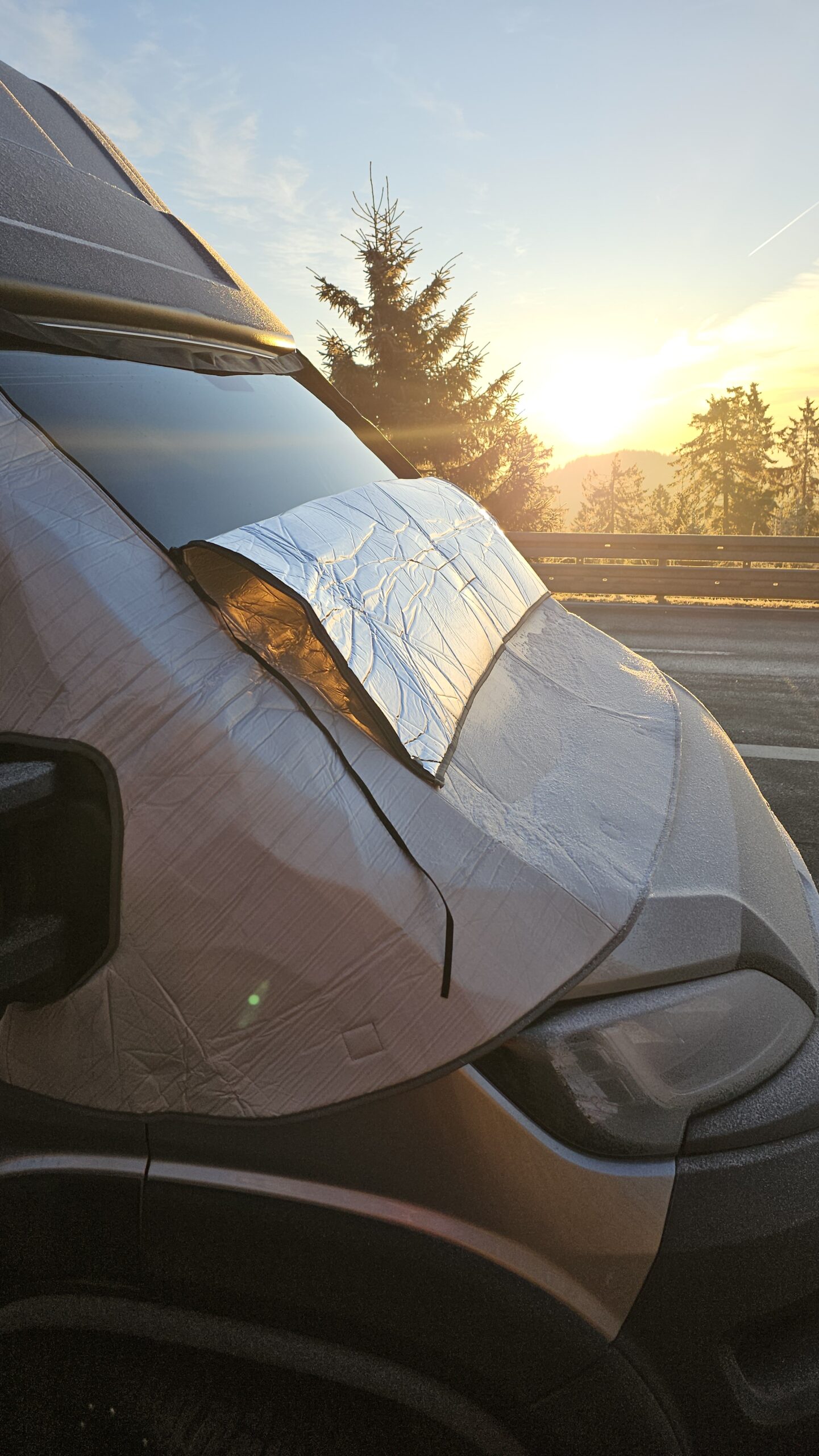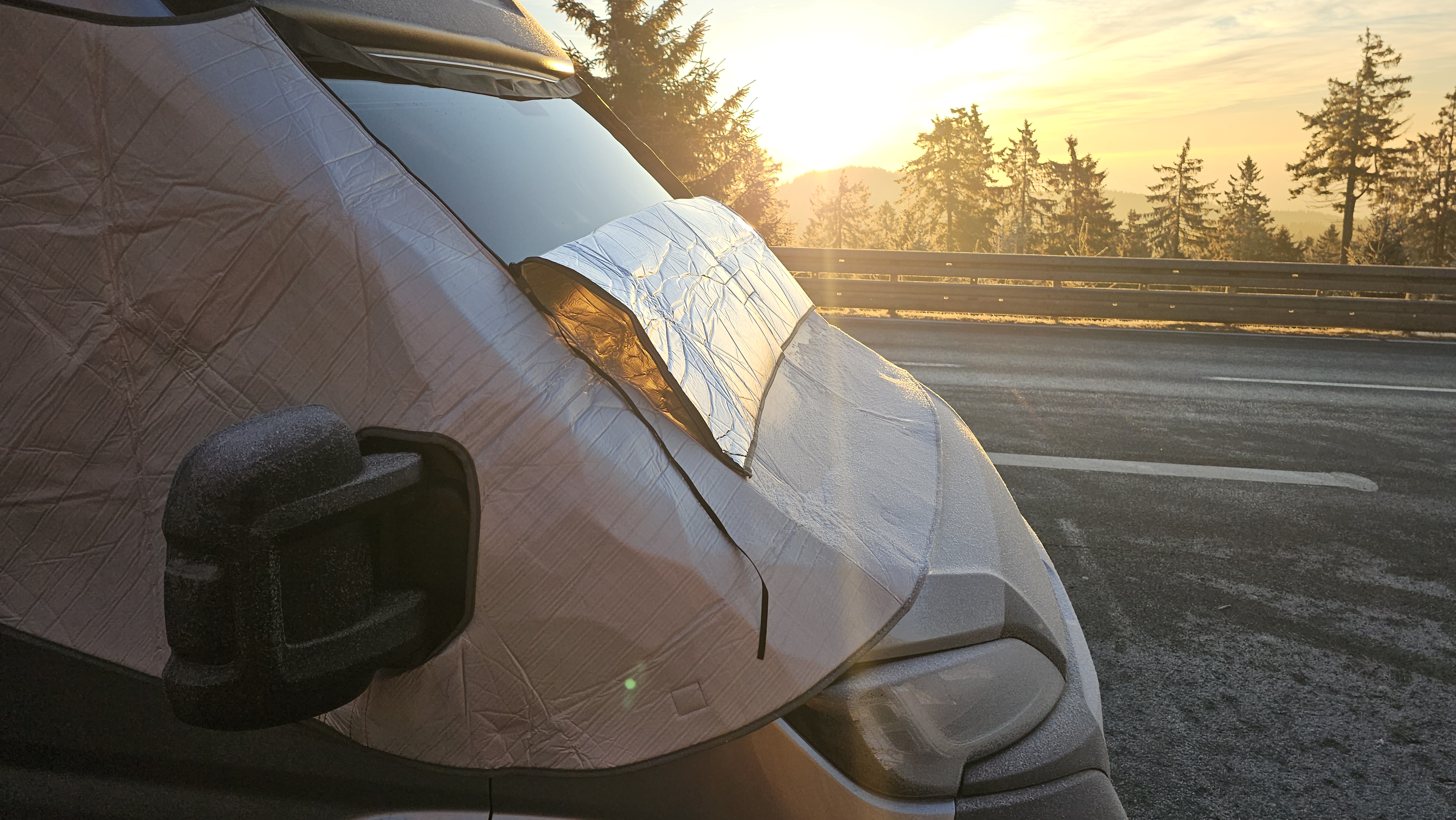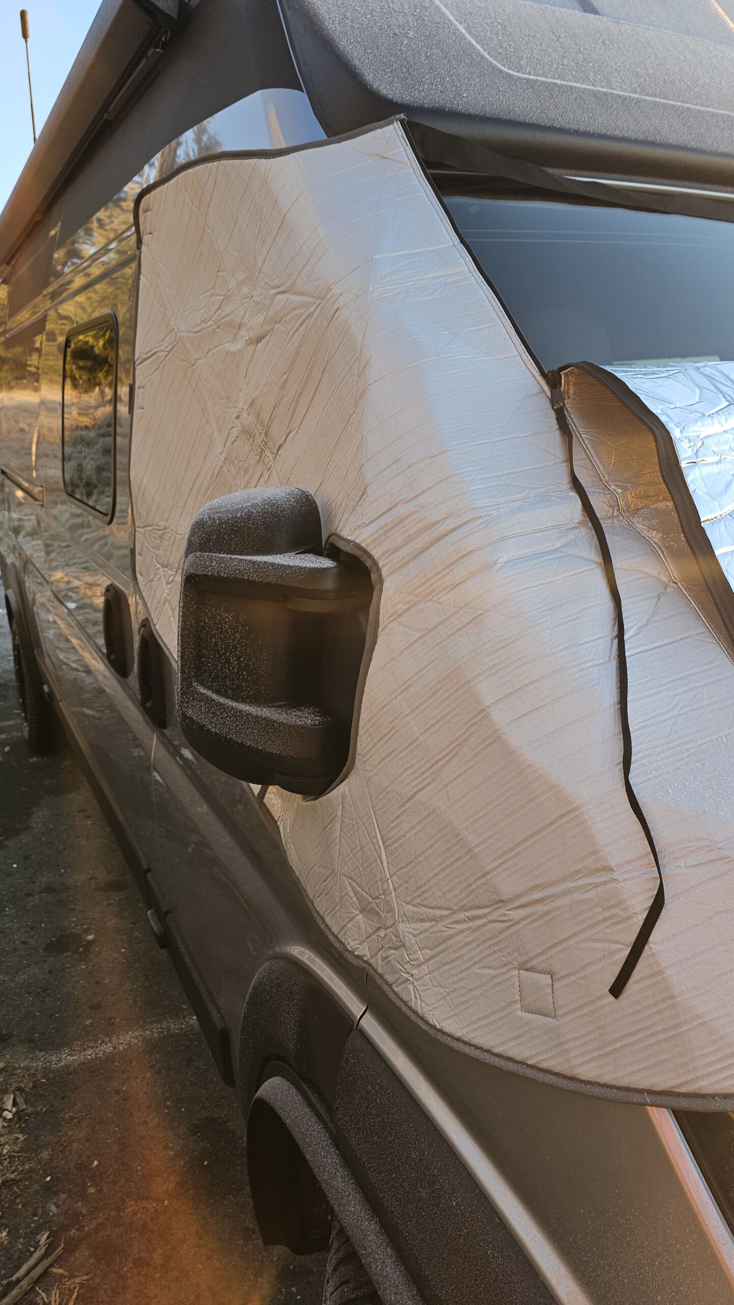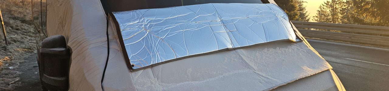 Im Praxiseinsatz zeigt sich sofort, dass die Optima Fahrerhaus-Isoliermatte sehr effektiv arbeitet. Besonders im Bereich des Fahrerhauses ist es spürbar wärmer, da die große Frontscheibe zuverlässig isoliert wird. Sehr positiv: Während des Tests trat keine Kondenswasserbildung an der Frontscheibe auf. Gerade bei kalten Nächten ist das ein klarer Vorteil und sorgt für ein angenehmeres Raumklima. Als besonders praktisch hat sich der mittige Reißverschluss erwiesen. Die Matte lässt sich bis zur Hälfte öffnen, sodass Tageslicht ins Fahrzeug fällt und man nach draußen schauen kann, ohne die Isolierung komplett abzunehmen. Das erhöht den Komfort deutlich, gerade morgens oder bei längeren Standzeiten. Die einzige echte Schwäche bleibt das Zusammenfalten nach der Nutzung. Mit Übung verliert dieser Punkt jedoch deutlich an Gewicht.