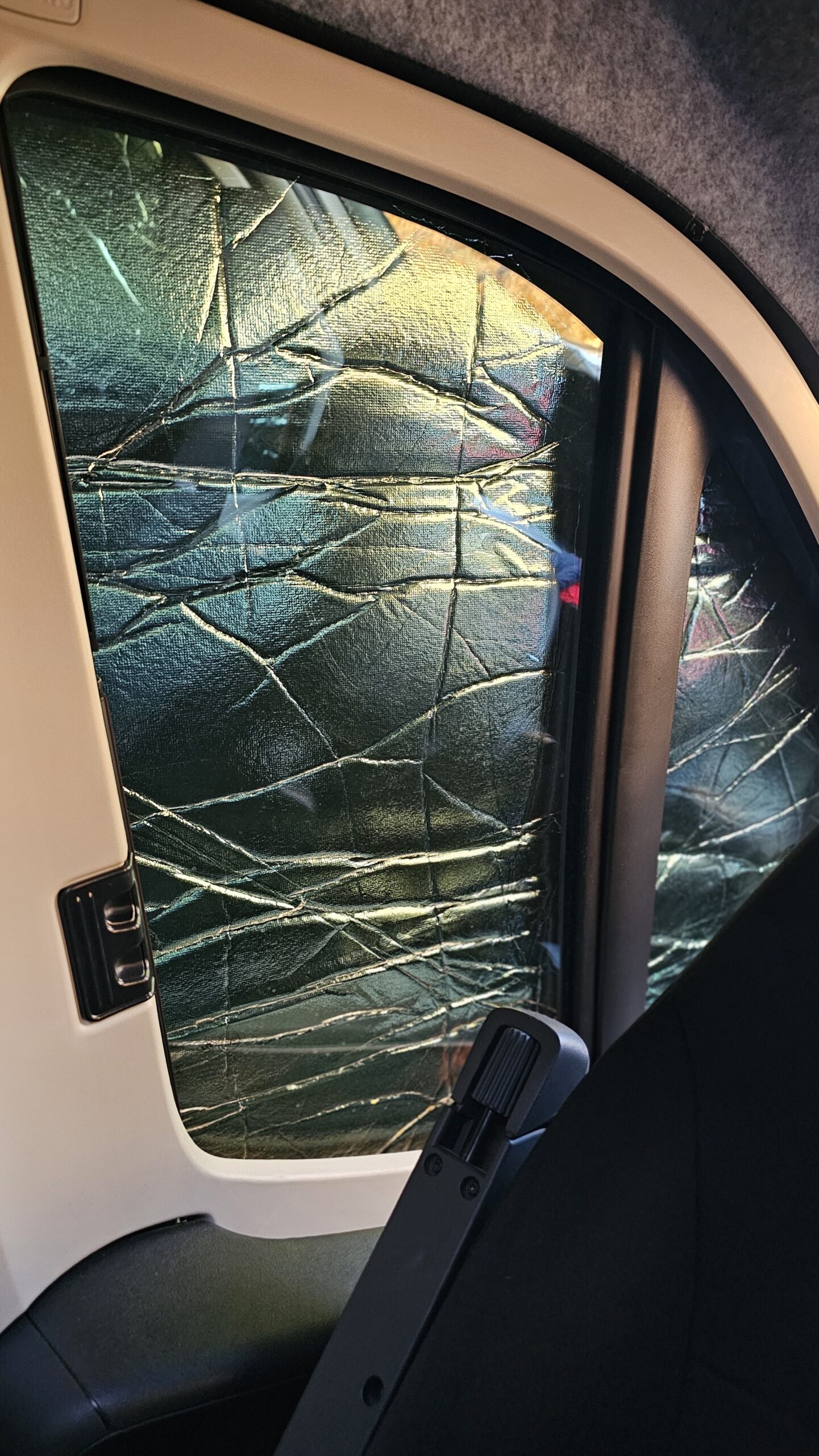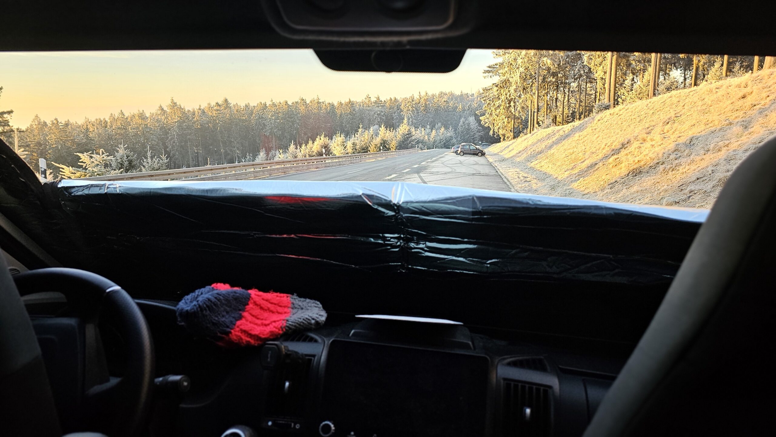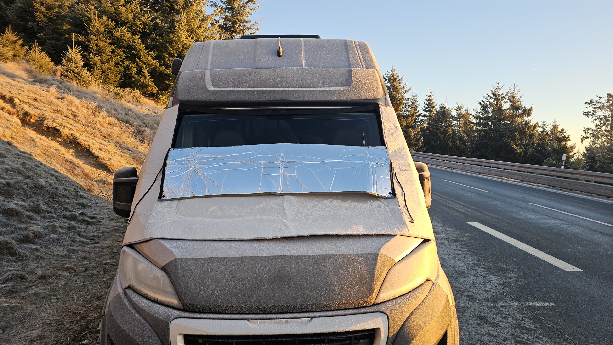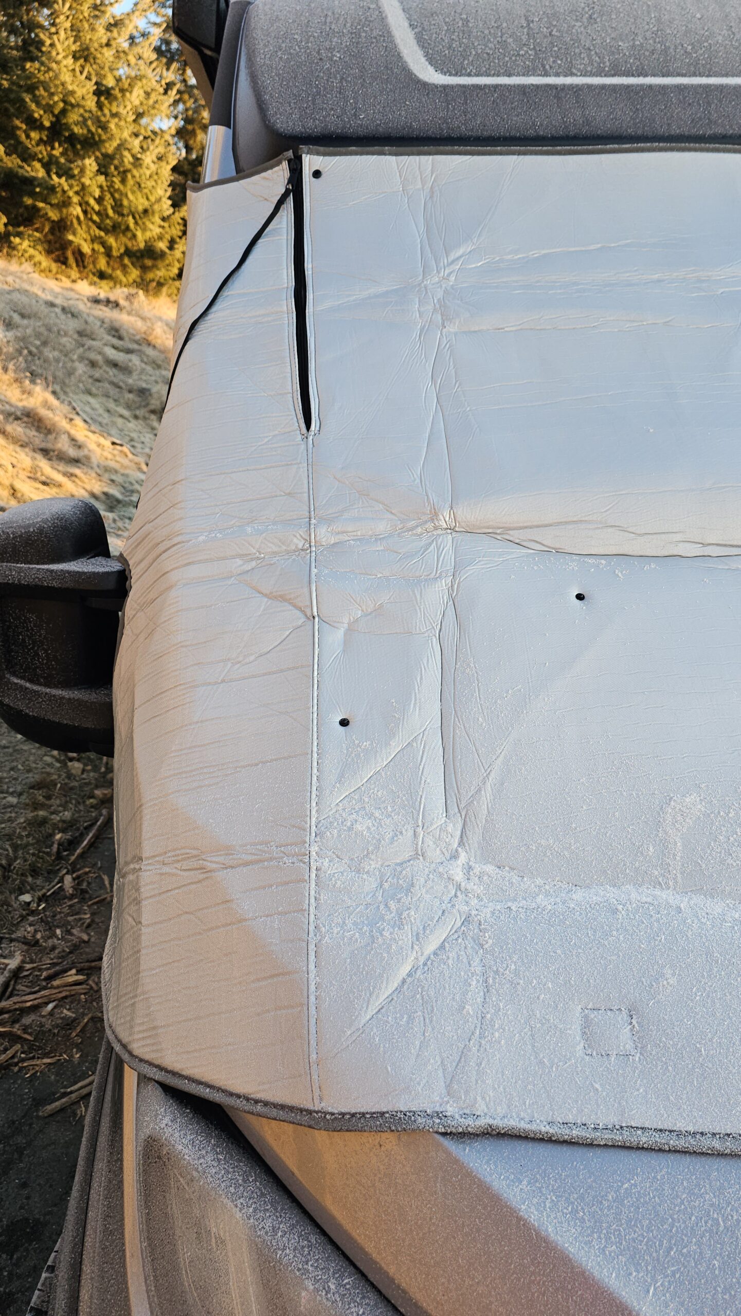 Im Praxiseinsatz zeigt sich sofort, dass die Optima Fahrerhaus-Isoliermatte sehr effektiv arbeitet. Besonders im Bereich des Fahrerhauses ist es spürbar wärmer, da die große Frontscheibe zuverlässig isoliert wird. Sehr positiv: Während des Tests trat keine Kondenswasserbildung an der Frontscheibe auf. Gerade bei kalten Nächten ist das ein klarer Vorteil und sorgt für ein angenehmeres Raumklima. Als besonders praktisch hat sich der mittige Reißverschluss erwiesen. Die Matte lässt sich bis zur Hälfte öffnen, sodass Tageslicht ins Fahrzeug fällt und man nach draußen schauen kann, ohne die Isolierung komplett abzunehmen. Das erhöht den Komfort deutlich, gerade morgens oder bei längeren Standzeiten. Die einzige echte Schwäche bleibt das Zusammenfalten nach der Nutzung. Mit Übung verliert dieser Punkt jedoch deutlich an Gewicht.