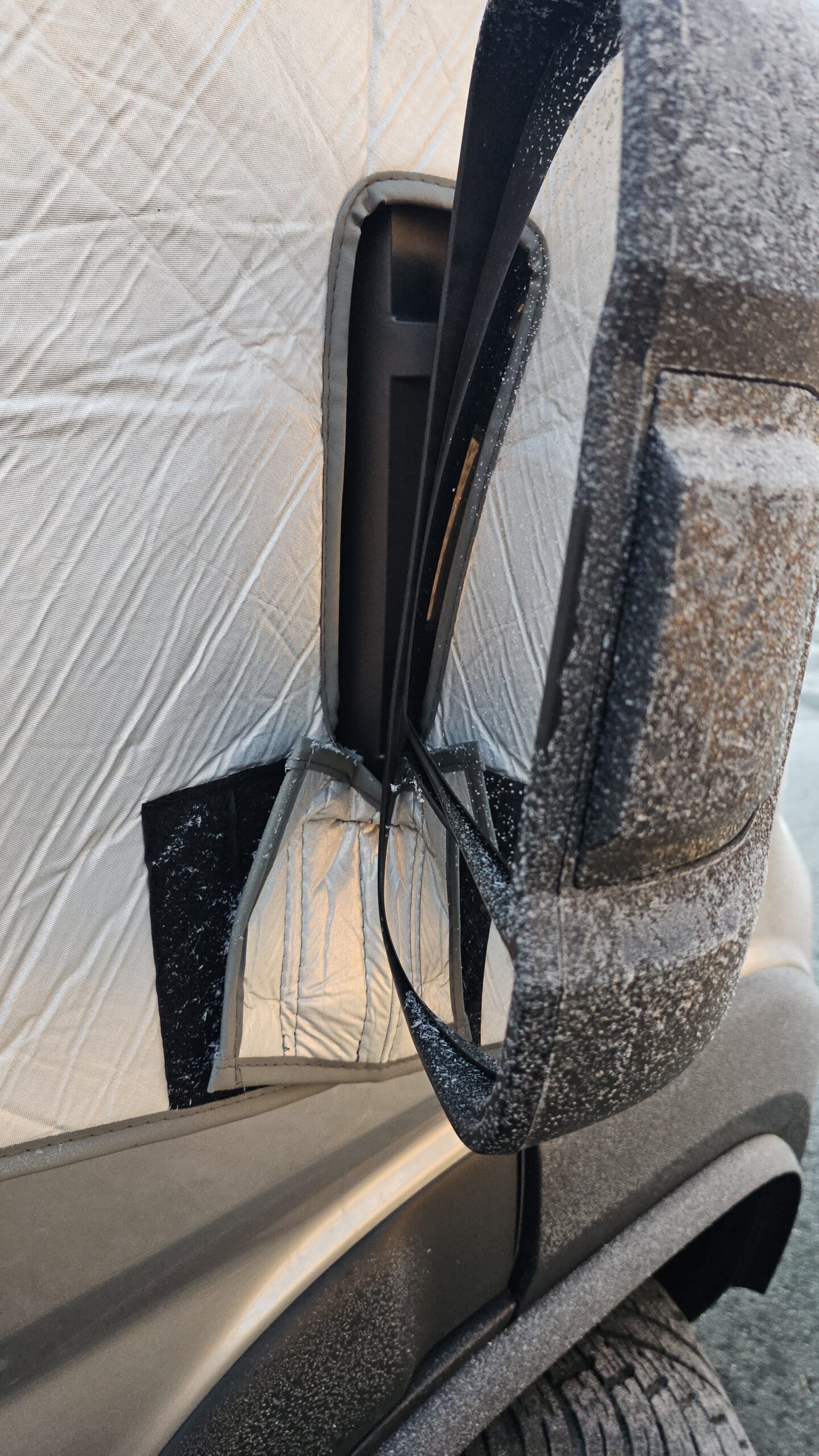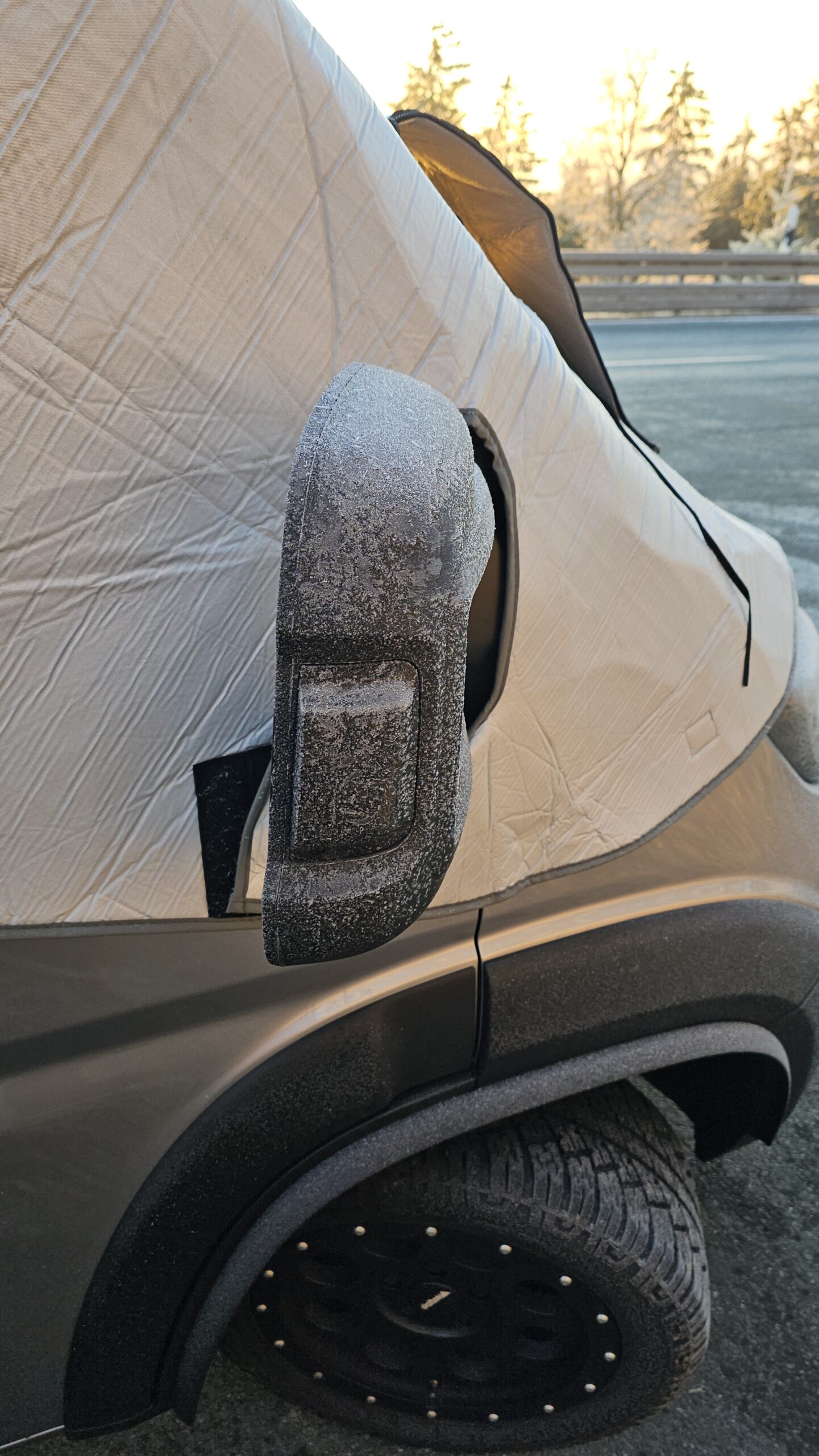 Demontage: Je nach Witterung sollte die Matte vor dem Abnehmen zunächst von Schnee oder Eis befreit werden. Wenn möglich und zeitlich machbar, empfiehlt sich ein kurzes Trocknen. Zum Abbau werden zuerst die Klettverschlüsse an der Matte an den Außenspiegeln geöffnet, anschließend die Türen geöffnet und die Kunststoffhaken ausgehängt. Die größte Herausforderung ist das anschließende Zusammenfalten, sodass die Matte wieder in die Tasche passt. Hier waren mehrere Versuche nötig, letztlich half ein Faltvideo im Netz. Mit etwas Übung klappt auch das zuverlässig.