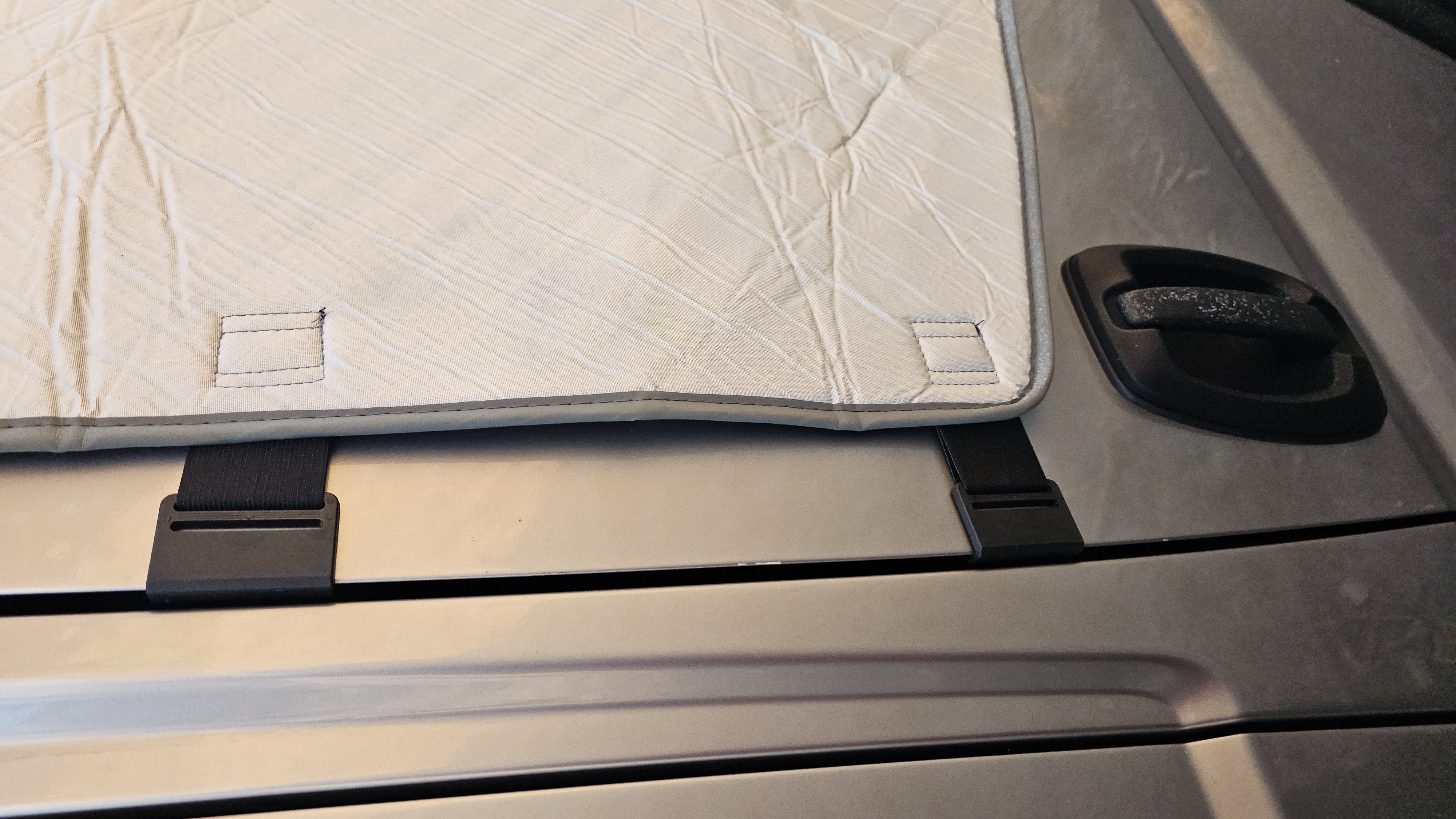 Montage: Die Montage ist insgesamt einfach und logisch aufgebaut. Zu zweit geht es etwas entspannter, ist aber auch alleine gut machbar. Empfehlenswert ist es, den Ablauf ein- bis zweimal zuhause zu üben. Die Matte wird aufgefaltet und mittig mit dem Logo nach oben auf die Frontscheibe gelegt. Anschließend werden die Klettverschlüsse an der Matte für die Außenspiegel geöffnet und die Matte über die Spiegel gelegt. Danach öffnet man jeweils die Türen, hängt die drei Kunststoffhaken in den Türrahmen ein und schließt die Türen wieder. Sitzt die Matte nicht sofort perfekt, reicht leichtes Nachziehen – dann passt sie zuverlässig.