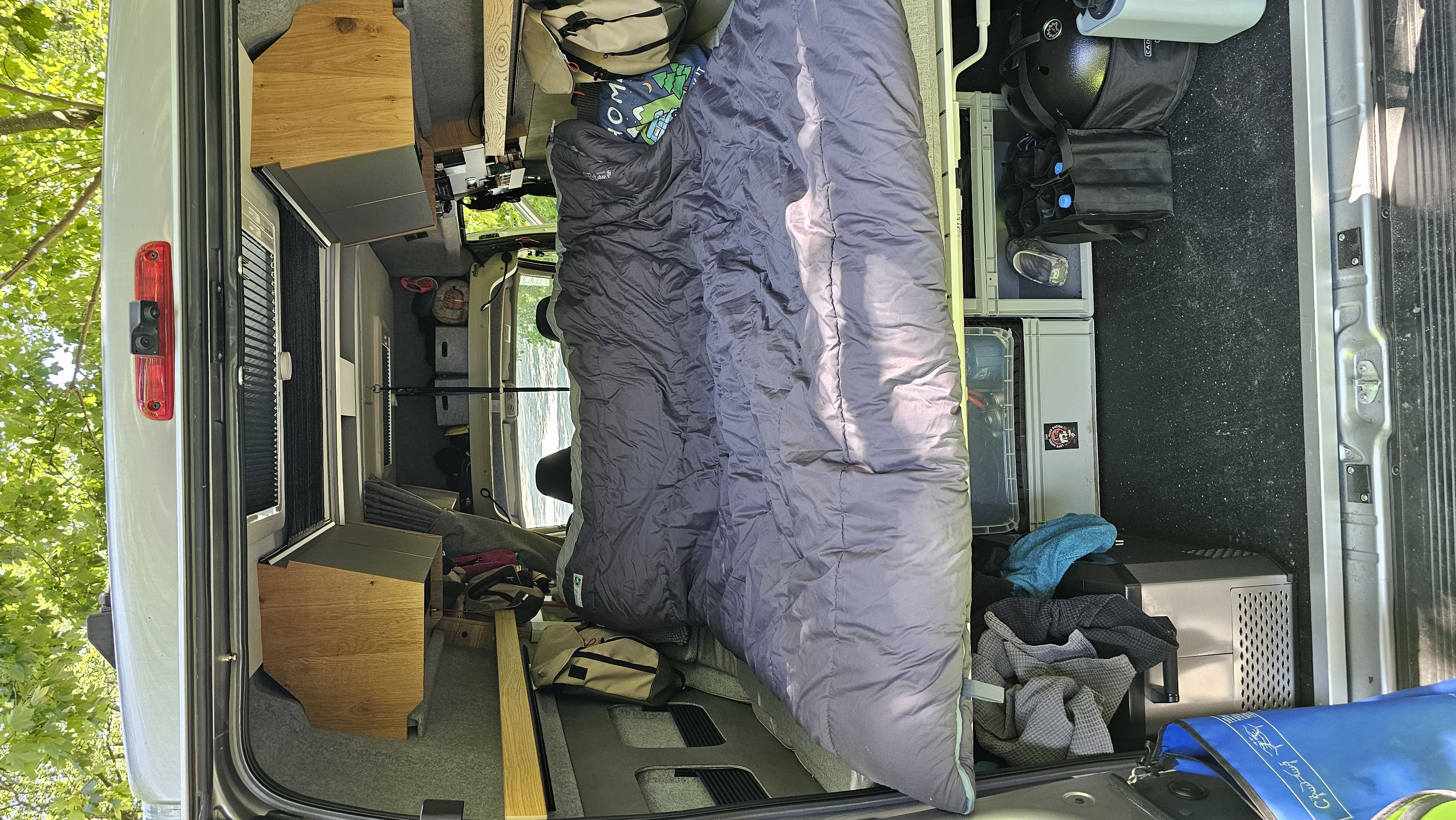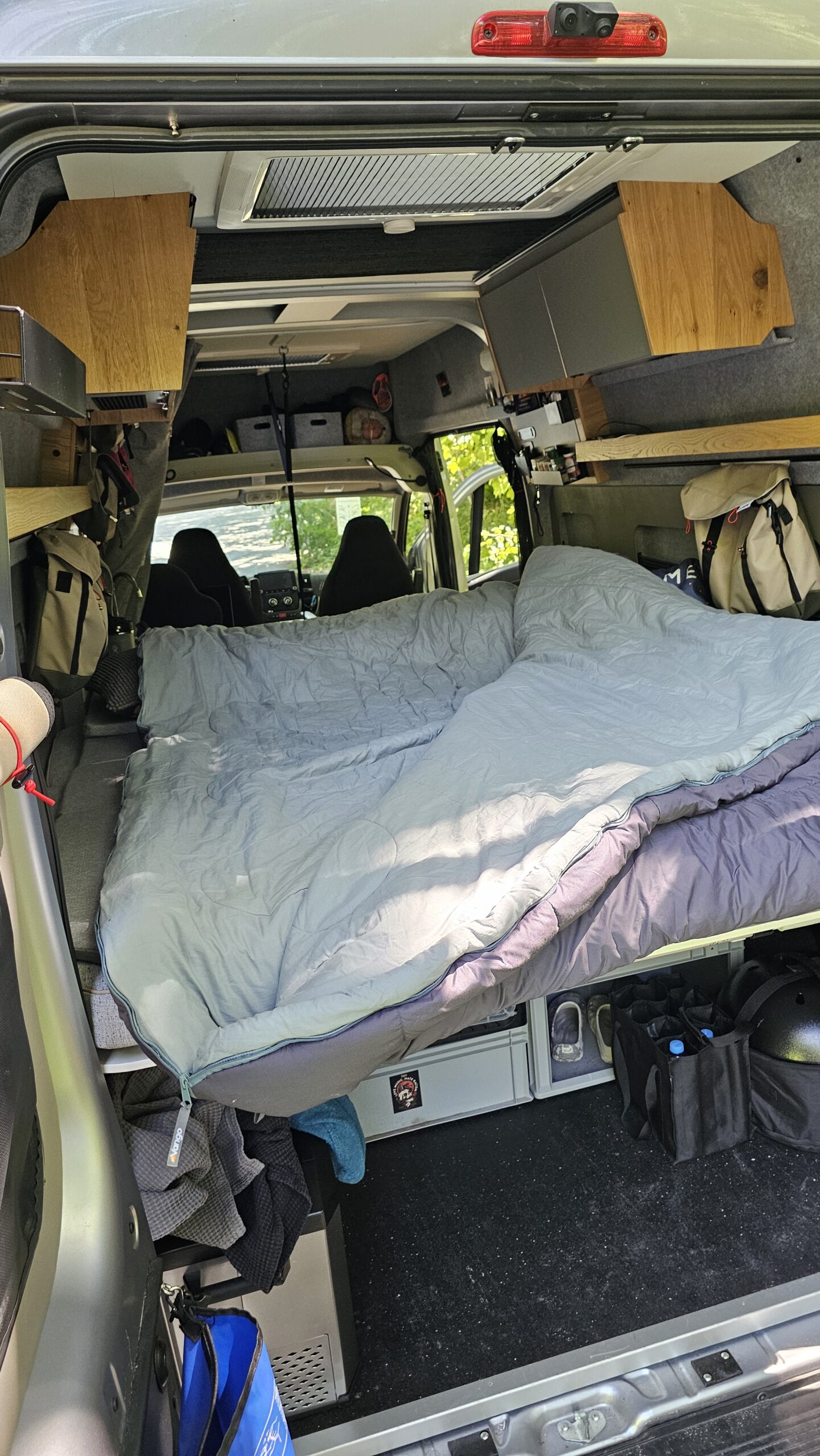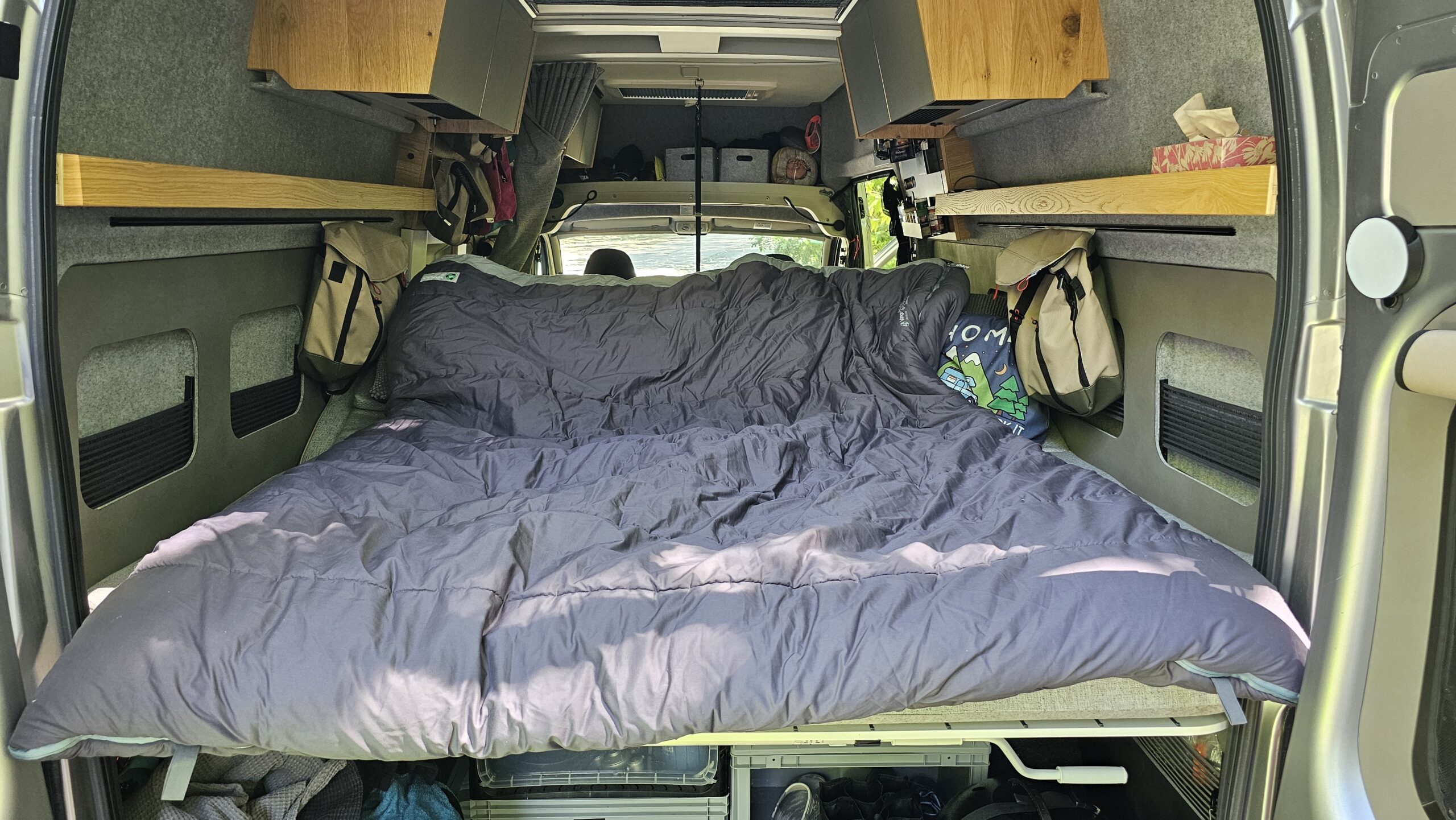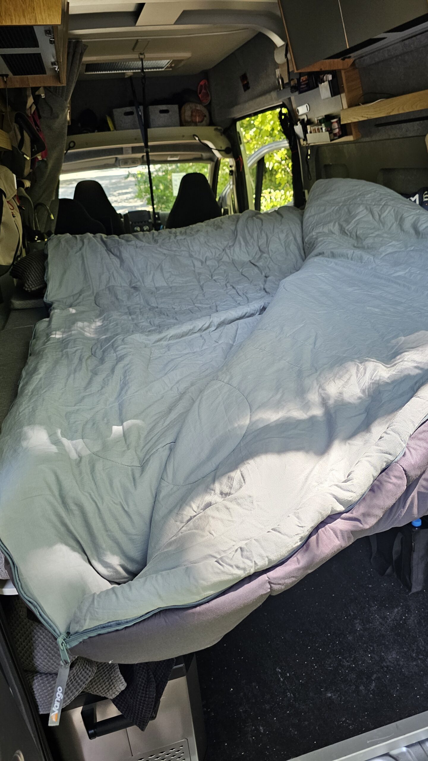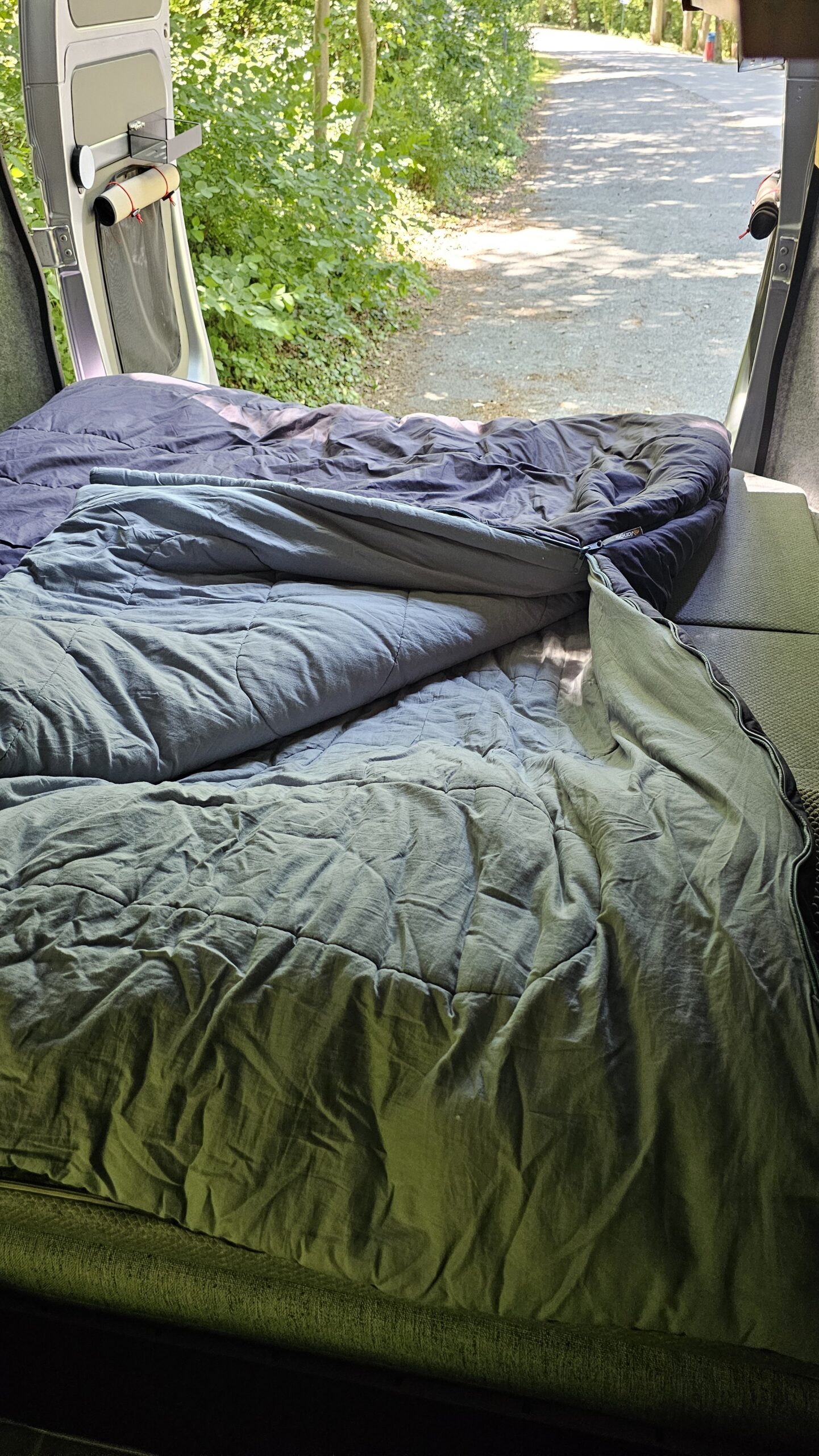 Im März wurde der Vango Shangri-La Luxe Kingsize von Björn und Melanie im Camper getestet – unter anderem während mehrerer Übernachtungen am Edersee sowie in der Rhön. Nach dem vorher genutzten „normalen“ Polaris Kingsize, der sich bei solchen Temperaturen als zu warm erwiesen hatte, kam nun der Shangri-La Luxe Kingsize zum Einsatz. Und das mit durchweg positiven Ergebnissen. Schon beim ersten Einsatz fiel das komfortable Raumgefühl auf. Trotz ihrer Körpergröße von 201 cm hatte Björn ausreichend Platz – nicht nur in der Länge, sondern auch in der Breite. Das großzügige Kingsize-Format ermöglichte beiden, sich bequem zu drehen und auszustrecken, ohne sich gegenseitig einzuschränken.
