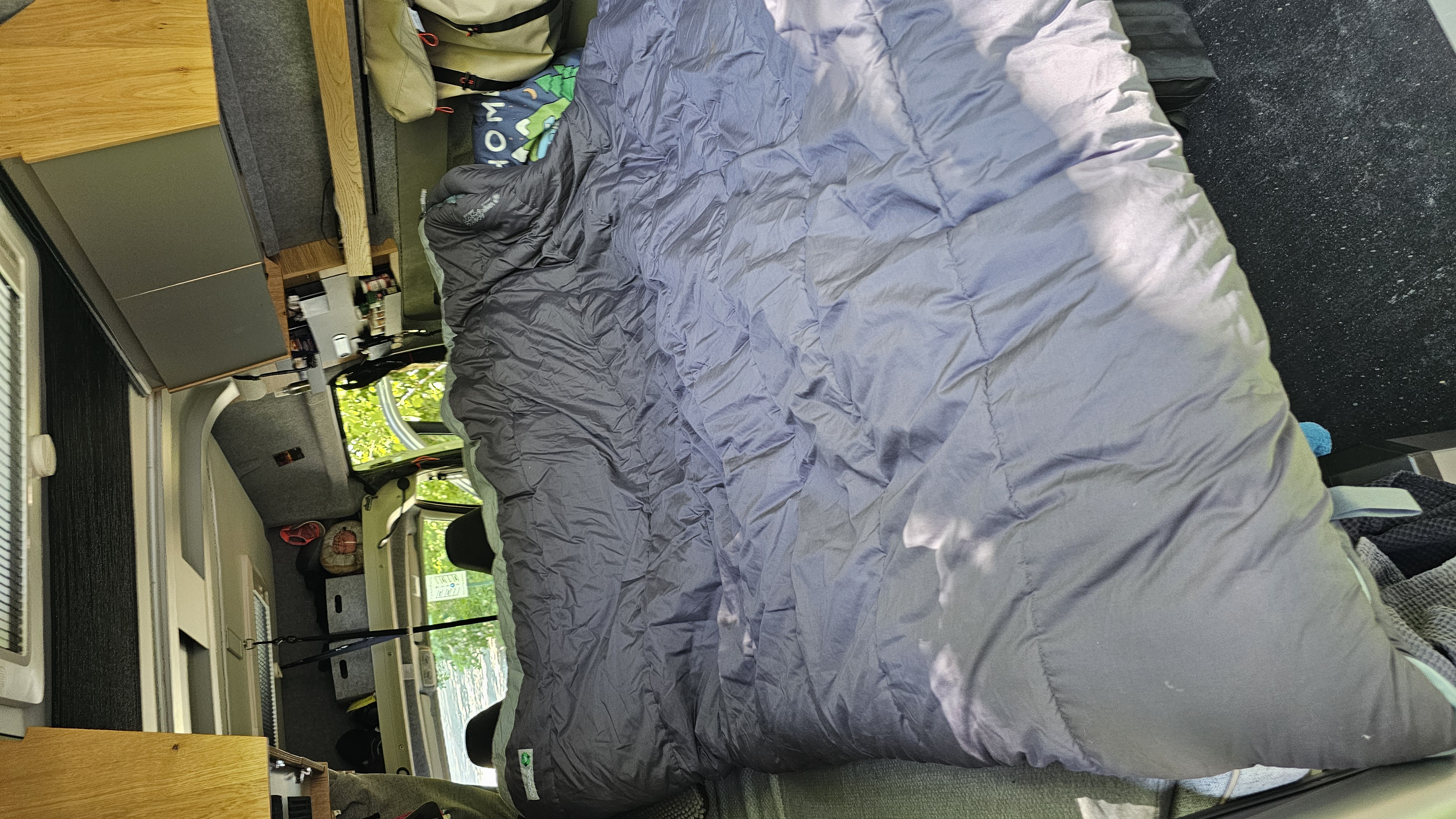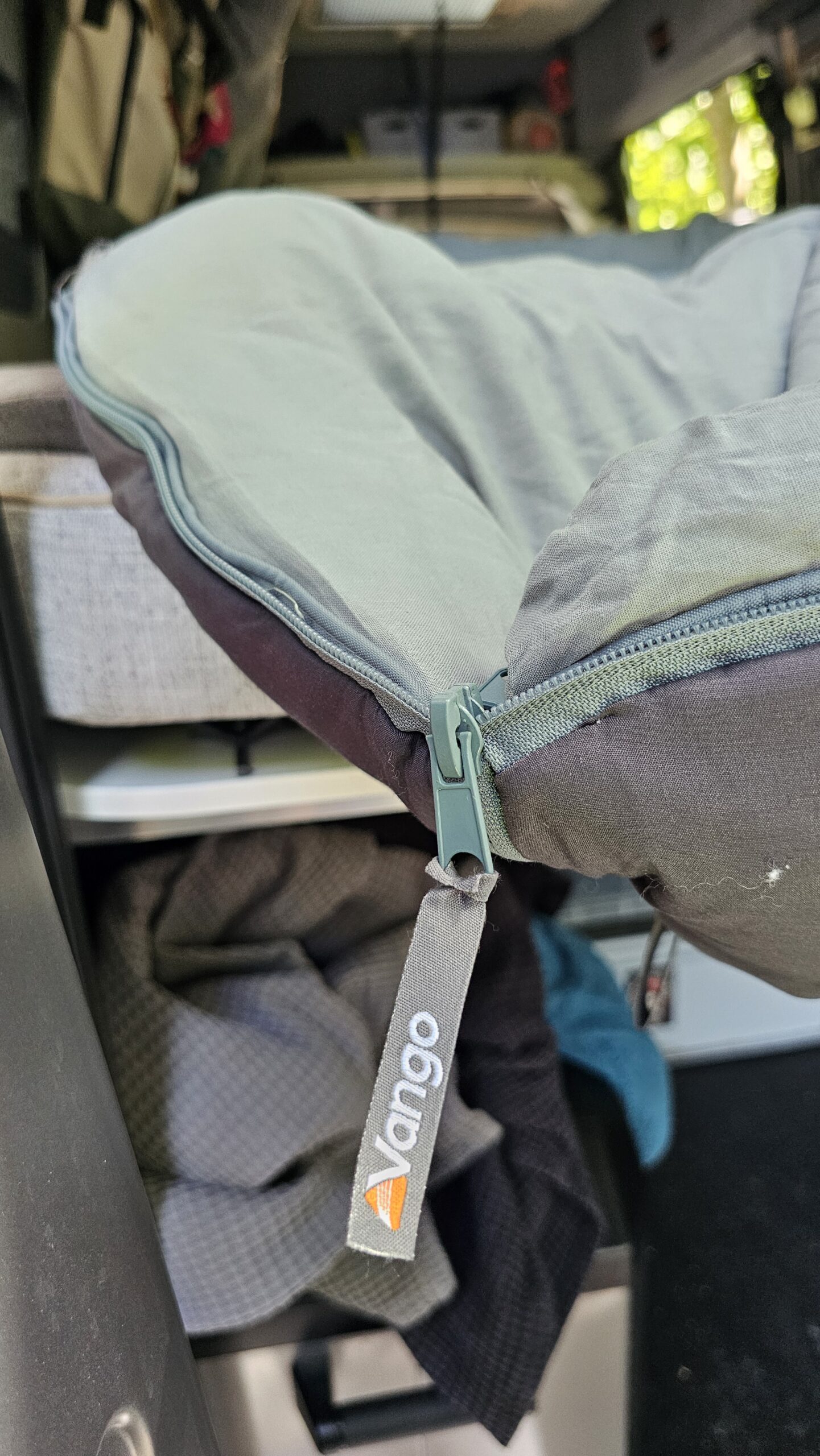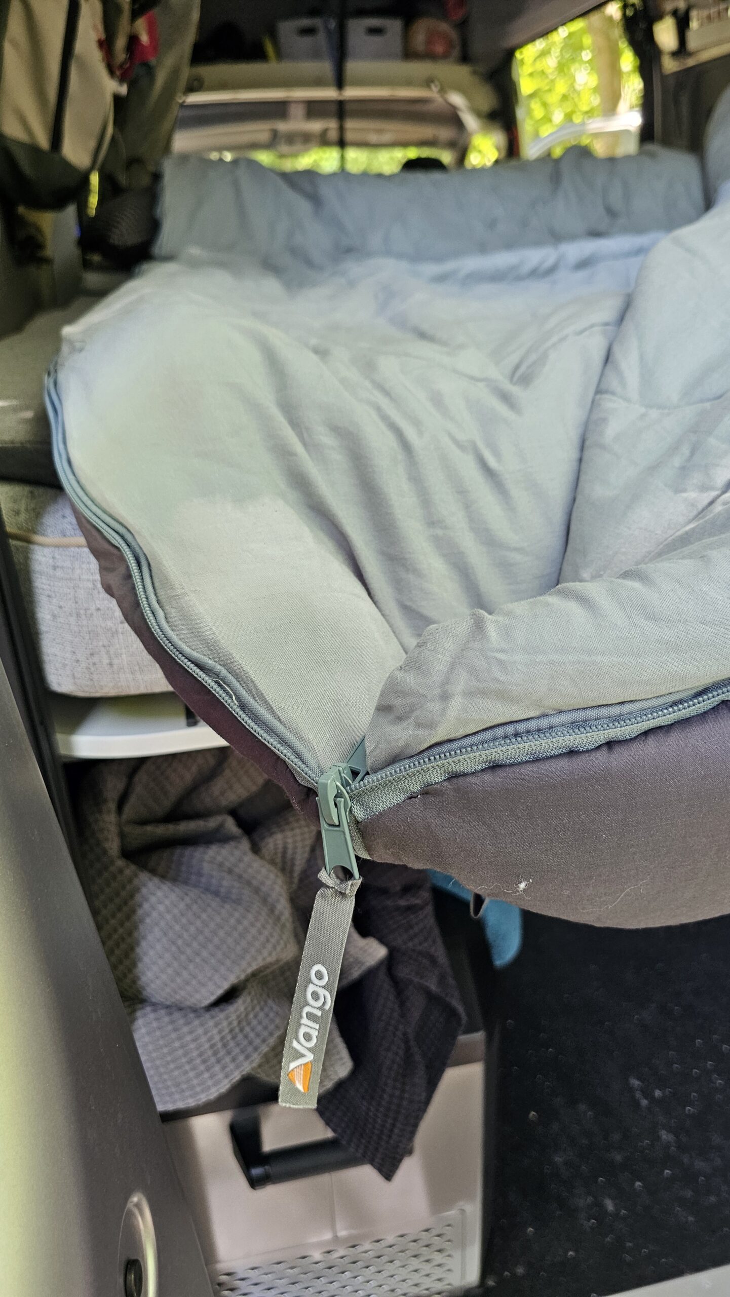 Besonders angenehm war die Temperaturregulierung im Schlafsack. In Nächten mit Außentemperaturen um die 5 bis 10 °C im nicht beheizten Camper fühlte sich der Schlafsack sofort angenehm warm an, ohne dass es zu Hitzestau kam. Die Wärmeverteilung war gleichmäßig, kalte Zonen oder Kältebrücken traten nicht auf. Auch das Innenmaterial wurde von beiden gelobt: Es fühlt sich weich und flauschig an – fast wie Baumwolle, dabei aber funktional und pflegeleicht. Der Reißverschluss ließ sich problemlos bedienen, auch nachts, und dank der isolierten Leiste zog keine Kälte ein. Morgens war der Schlafsack angenehm trocken – ein Zeichen für die gute Atmungsaktivität und Feuchtigkeitsregulierung des Materials. Insgesamt zeigte sich der Polaris Kingsize Neptune als ideale Lösung für kühle Nächte im Camper, besonders in der Übergangszeit.