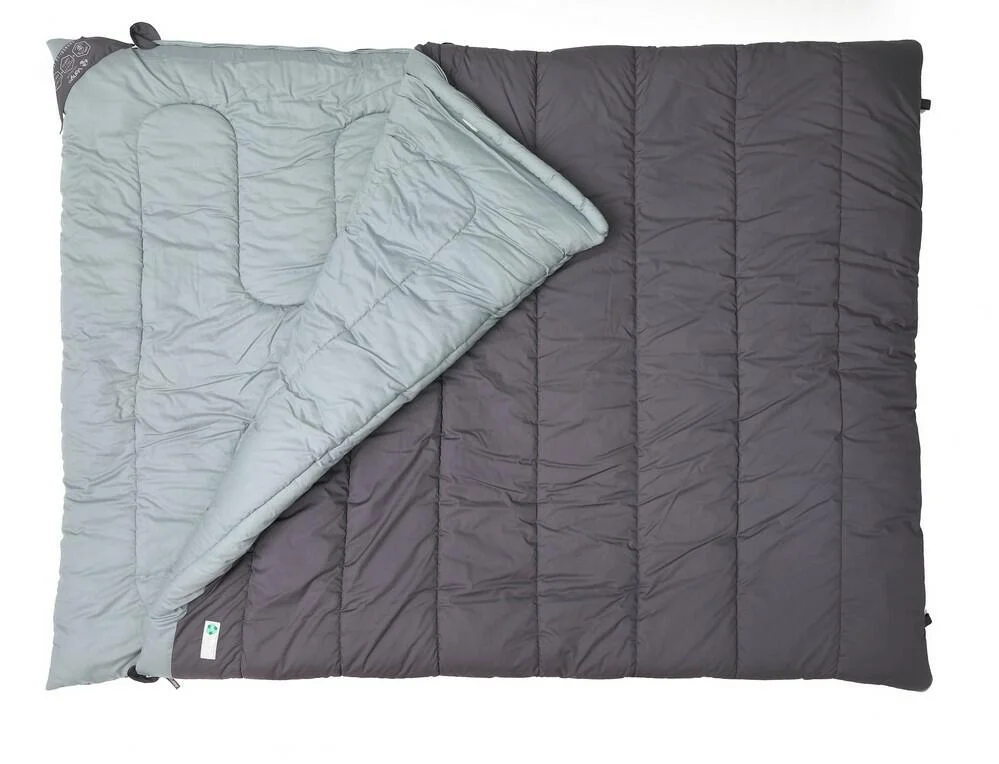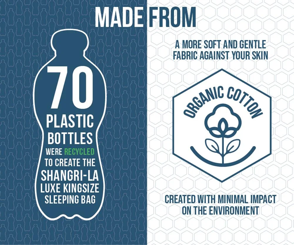 Der Vango Shangri-La Luxe Kingsize wurde um diese wunderschöne neue Reihe von Luxusschlafsäcken erweitert, die unsere preisgekrönten Shangri-La-Matten für die ultimative Nachtruhe ergänzen. Als Teil unserer Earth Collection wurde der Schlafsack aus Bio-Baumwolle und 100 % recyceltem Material polyester hergestellt, was ihn zu einer nachhaltigeren Wahl macht. Dieser quadratisch geformte Kingsize-Schlafsack mit integrierter Kopfstütze bietet den zusätzlichen Platz und Komfort, den Sie für den perfekten Schlaf benötigen. Die gebürstete Bio-Baumwolle ist hypoallergen und fühlt sich weich auf der Haut an, ähnlich wie Ihre kuschelige Winterbettwäsche zu Hause, die in kalten Nächten weich, bequem und angenehm zu berühren ist. Eine der einzigartigen Eigenschaften dieses Rückens ist seine Vielseitigkeit, denn der Beutel kann vollständig getrennt werden, um zwei einzelne Beutel oder zwei Decken zu bilden. Außerdem ist er bei 30 Grad in der Maschine waschbar und wird in einem Kompressions-Tragesack geliefert, der ein kleineres Packmaß hat und sich leicht verstauen lässt. Schlafen Sie wie die Könige auf Ihren camping oder Wohnmobilreisen und nutzen Sie ihn im Alltag, wenn Sie Familie oder Freunde zu Besuch haben.